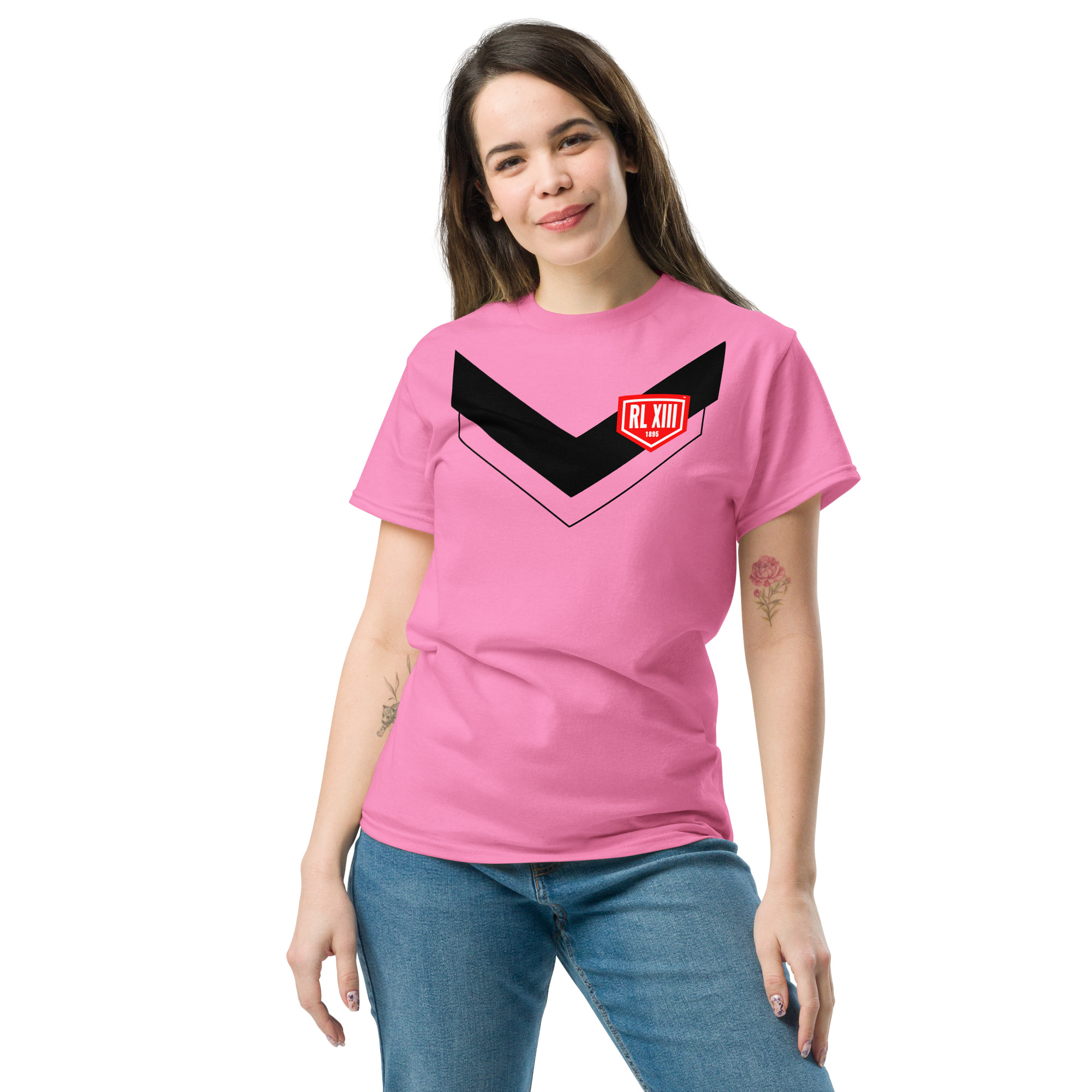 The RL XIII Black Boxed Rugby League Chevron on Azalea Pink T-Shirt combines bold rugby league heritage with modern streetwear style.