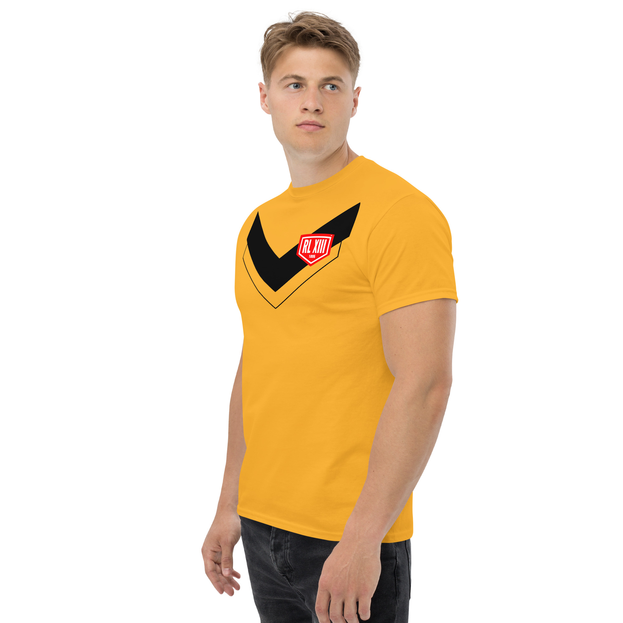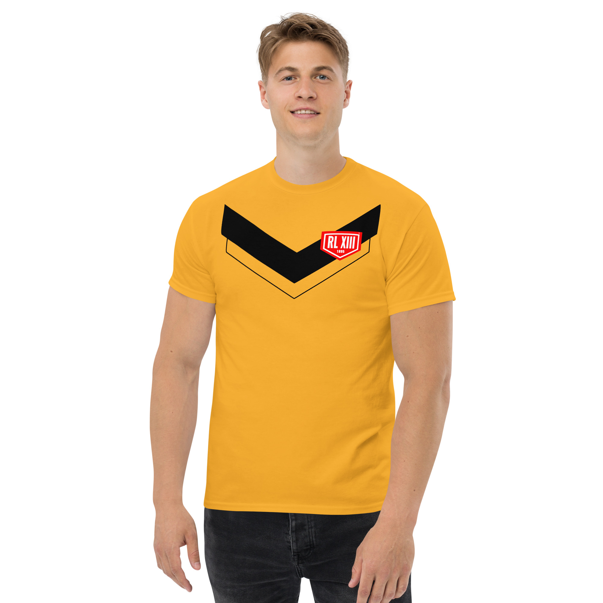 The RL XIII Black Boxed Rugby League Chevron on Gold T-Shirt delivers a bold, high-impact look inspired by rugby league tradition and modern streetwear style.