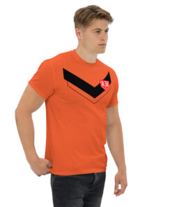 The RL XIII Black Boxed Rugby League Chevron on Orange T-Shirt delivers a striking look, combining a vibrant orange base with a sharp black boxed chevron graphic that nods to traditional league heritage.