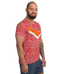 Designed with intricate Tongan-inspired patterns drawn from Tongan motifs, this all-over print reflects strength, unity, and respect for ancestry—values deeply embedded in both rugby league and Tongan culture. The design flows seamlessly across the entire garment, creating a powerful visual impact that stands out on match day, in the gym, or on the street.